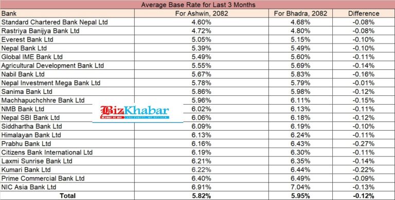 पछिल्लो महिनामा २० वाणिज्य बैंकहरुको औसत आधार दर ०.१२ प्रतिशत विन्दुले घटेको छ । असोज महिनाको लागि वाणिज्य बैंकहरुको औसत आधार दर ५.८२ प्रतिशत निर्धारण भएको छ । भदौ महिनाका लागि वाणिज्य बैंकको औसत आधारदर ५.९५ प्रतिशत निर्धारण भएको थियो ।