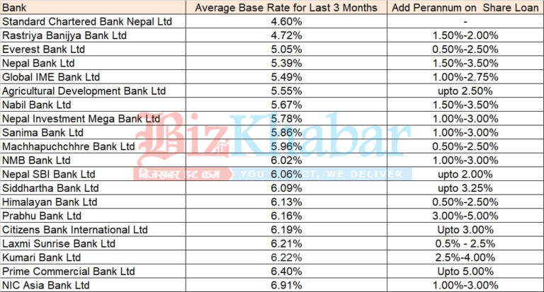 अहिले बैंकहरुको ब्याजदर निकै तल आएको कारण अधिकांश बैंकको सेयर धितो कर्जा एकंल अंकमा रहेको छ । ८ वाणिज्य बैंकको आधार दर ६ प्रतिशतभन्दा कम रहेको छ । सबैभन्दा धेरै बेस रेट हुनेमा एनआइसी एसिया बैंक रहेको छ । यसको बेस रेट ७.९१ प्रतिशत छ ।