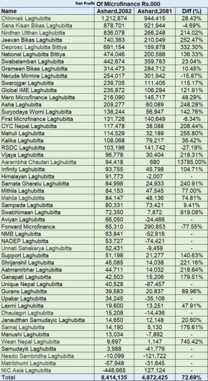 अघिल्लो वर्षको यसै अवधिमा यी कम्पनीहरुले ४ अर्ब ८७ करोड २४ लाख २५ हजार रुपैयाँ खुद नाफा कमाएका थिए । केन्द्रीय बैंकले लघुवित्त कम्पनीहरुका लागि केही सहज नीति लिएसँगै नाफामा आकर्षक वृद्धि भएको हो । विशेषत केन्द्रीय बैंक कर्जा पुनर्संरचनाको व्यवस्थामा लचिलो बनिदिंदा लघुवित्तहरुको नाफा बढेको हो ।