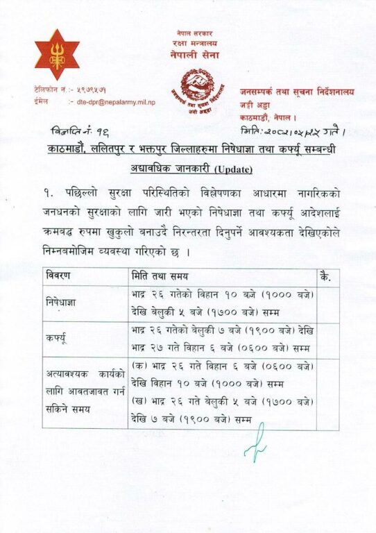 सैनिक जनसम्पर्क तथा सूचना निर्देशनालयका अनुसार निषेधाज्ञा भदौ २६ गतेको बिहान १० देखि बेलुकी ५ बजेसम्म लागू हुनेछ । कर्फ्यू भने भदौ २६ गते बेलुकी ७ बजेदेखि भदौ २७ गते बिहान ६ बजेसम्मका लागि जारी गरिएको छ ।