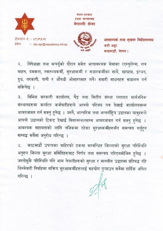 उक्त समयमा सरकारी कार्यालय, बैङ्क तथा वित्तीय संस्थालगायत सार्वजनिक संस्थानमा कार्यरत कर्मचारीले आफ्नो परिचयपत्र देखाई कार्यालयसम्म आवतजावत गर्न सक्नु हुनेछ । यस्तै, आन्तरिक तथा अन्तर्राष्ट्रिय उडानका यात्रुहरूले आफ्नो उडानको टिकट देखाई विमानस्थलसम्म आवतजावत गर्न सक्नु हुने सेनाले स्पष्ट गरेको छ ।