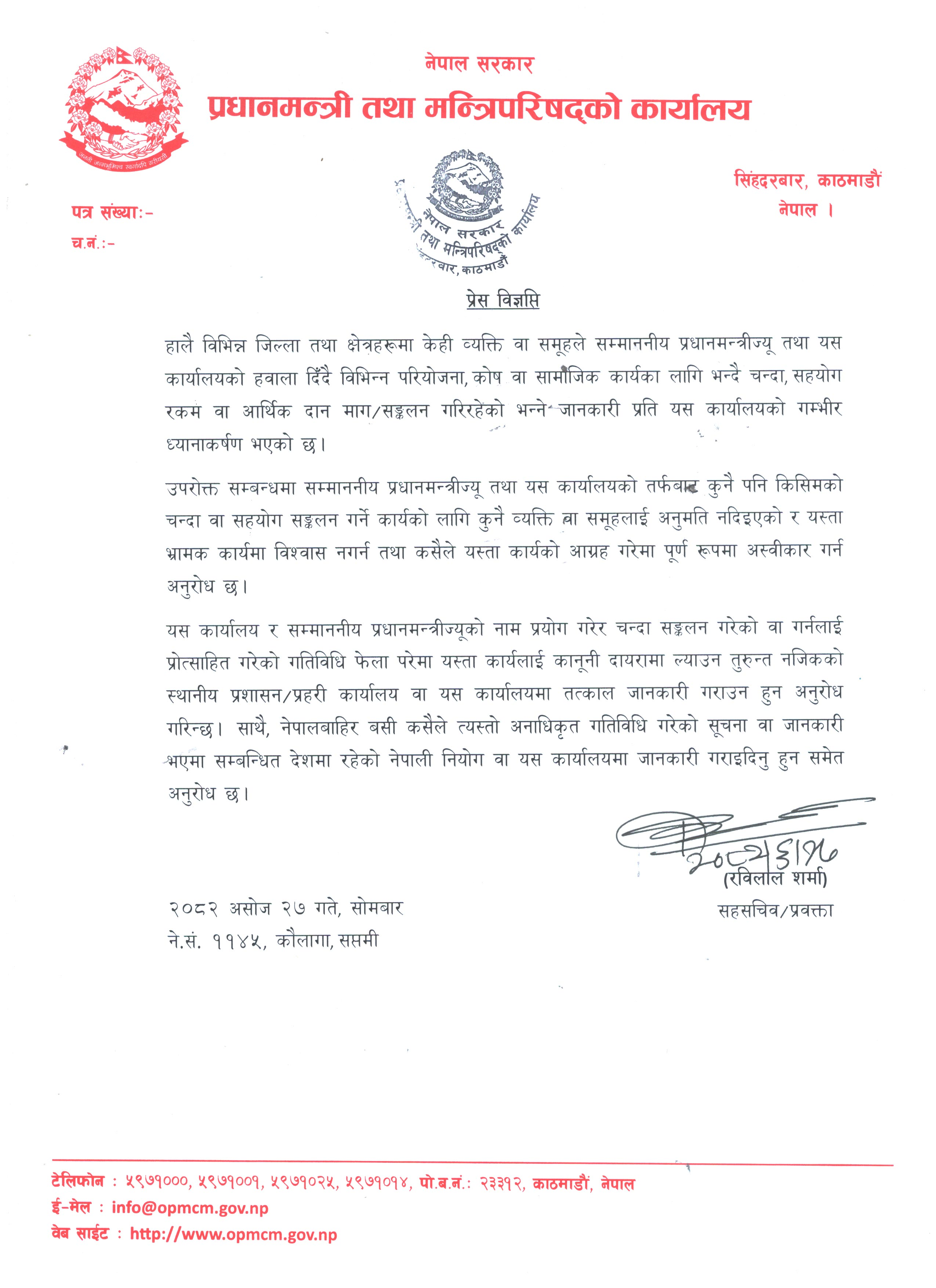 हाल विभिन्न जिल्ला तथा क्षेत्रमा केही व्यक्ति तथा समूहले प्रधानमन्त्री तथा कार्यालयको हवाला दिँदै विभिन्न परियोजना, कोष तथा सामाजिक कार्यका लागि भन्दै चन्दा, सहयोग रकम वा आर्थिक दान माग तथा संकलन गरिरहेको जानकारी आएको भन्दै यसप्रति आफ्नो गम्भीर ध्यानाकर्षण भएको प्रधानमन्त्री कार्यालयले जनाएको छ।