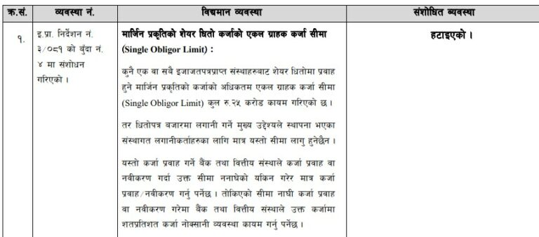 कुनै एक वा सबै इजाजतपत्रप्राप्त संस्थाहरुबाट सेयर धितोमा प्रवाह हुने मार्जिन प्रकृतिको कर्जाको अधिकतम एकल ग्राहक कर्जा सीमा २५ करोड कायम गरिएको थियो । त्यो सिमा हटाइएको हो ।