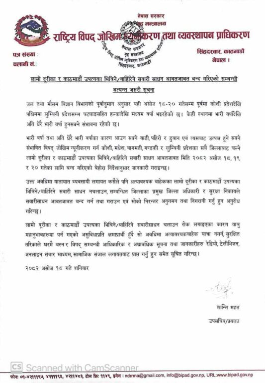 ‘भारी वर्षा तथा अति धेरै भारी वर्षाका कारण आउन सक्ने बाढी, पहिरो र डुबान एवं त्यसबाट उत्पन्न हुने सक्ने सम्भावित विपद् जोखिम न्यूनीकरण गर्न कोशी, मधेस, बागमती, गण्डकी र लुम्बिनी प्रदेशका सबै जिल्लाबाट चल्ने लामो दूरीका र काठमाडौँ उपत्यका भित्रिने र बाहिरिने सवारी साधन आवतजावत मिति २०८२ असोज १८, १९ र २० गतेका लागि बन्द गरिएको बेहोरा निर्देशानुसार जानकारी गराइन्छ’, प्राधिकरणले सूचना मार्फत भनेको छ ।