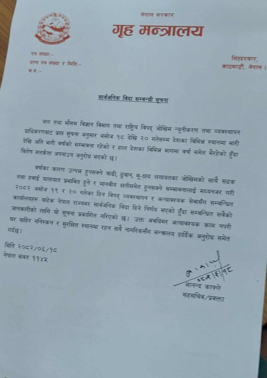 तर, अविरल वर्षाको कारण सवारी आवागमन र जनजीन कष्टकर बनेपछि गृह मन्त्रालयले आइतबार र सोमबार सार्वजनिक विदा दिने निर्णय गरेको हो ।