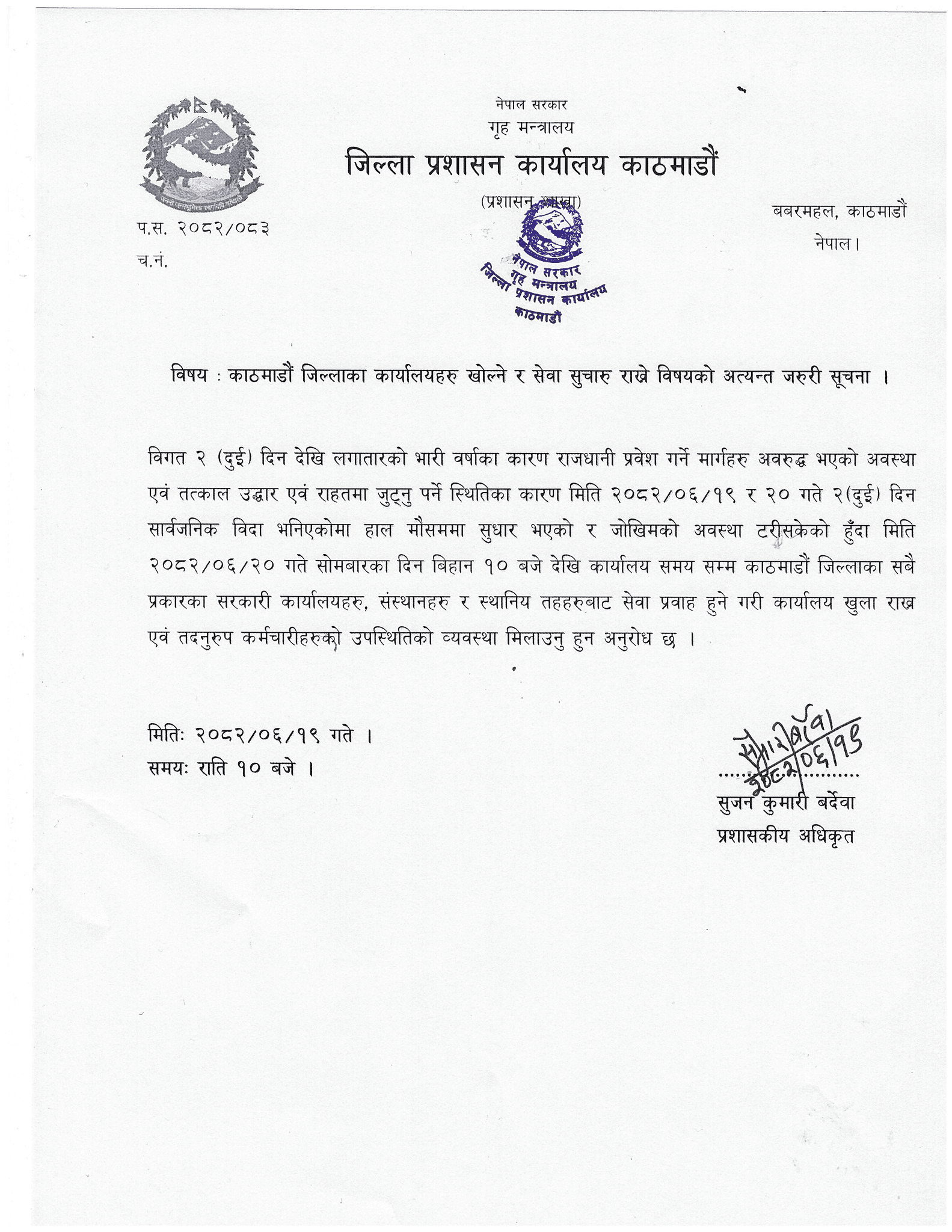 काठमाडौँ प्रशासनले जारी गरेको सूचनामा भनिएको छ, ‘मिति २०८२र०६र२० सोमबार बिहान १० बजे देखि कार्यालय समयसम्म काठमाडौँ जिल्लाका सबै प्रकारका सरकारी कार्यालयहरू, संस्थानहरू र स्थानीय तहहरूबाट सेवा प्रवाह हुने गरी कार्यालय खुला राख्न तथा कर्मचारीहरूको उपस्थितिको व्यवस्था मिलाउन अनुरोध गरिएको छ।’