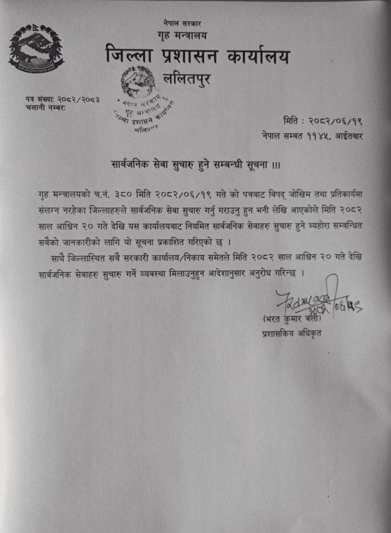 यस्तै, ललितपुर प्रशासनले पनि गृह मन्त्रालयको निर्देशनअनुसार सोमबारदेखि सबै सार्वजनिक सेवा नियमित रूपमा सञ्चालन हुने जनाएको छ। यसअघि सरकारले २० गतेसम्म बिदा दिने निर्णय गरेको थियो। तर गृह मन्त्रालयले विपद् जोखिम तथा प्रतिकार्य कार्यमा प्रत्यक्ष रूपमा संलग्न नरहेका जिल्लाहरूलाई सेवा नियमित सञ्चालन गर्न निर्देशन दिएसँगै राजधानीका दुवै जिल्लामा बिदा खारेज गरिएको हो। यससँगै काठमाडौँ र ललितपुरका सबै सरकारी कार्यालय, संस्थान र स्थानीय तहहरू सोमबारदेखि पुनः नियमित रूपमा सञ्चालन हुने भएका छन्।